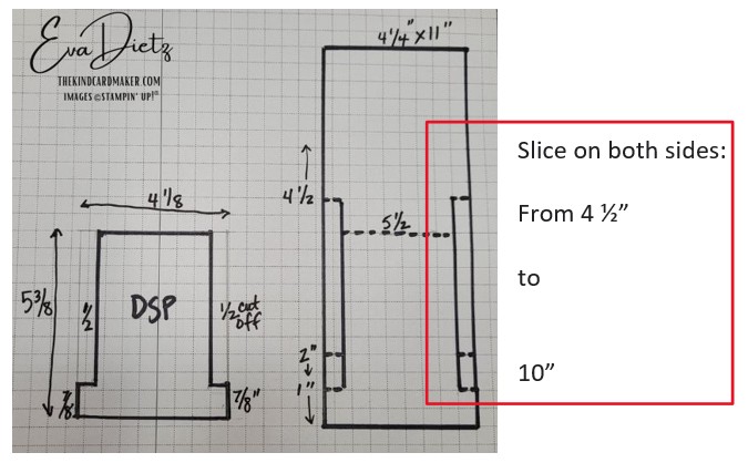 - Prepare Berry Burst Card Base, score and cut as shown on diagram below. Burnish score lines with bone folder. The solid black lines are cutting lines; dashed lines are scoring lines. The amount to slice open is a ½” width in on each side of the base starting at 4 ½’ down to 10” on the front side.